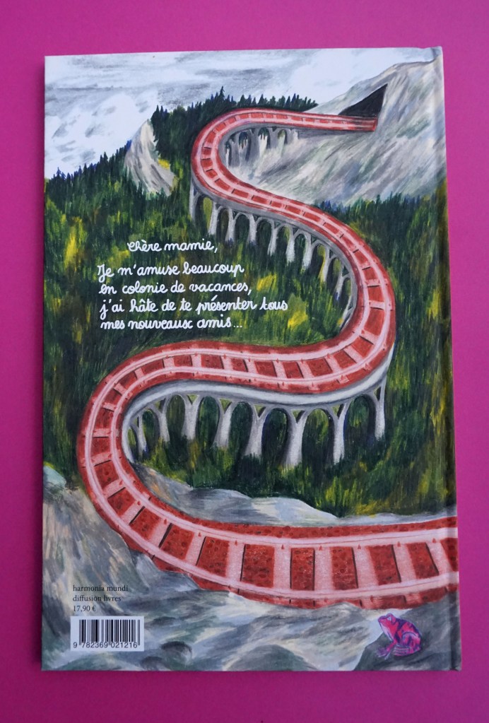 Alice envoie une lettre à sa grand-mère depuis sa colonie de vacances. Dans le texte, rien de plus normal : le quotidien d’une colonie de vacances le temps d’un été. Mais les images nous emmènent ailleurs : les personnages sont des animaux ou des extraterrestres, les paysages sont extraordinaires, dignes de la science-fiction ou des contes de fées.