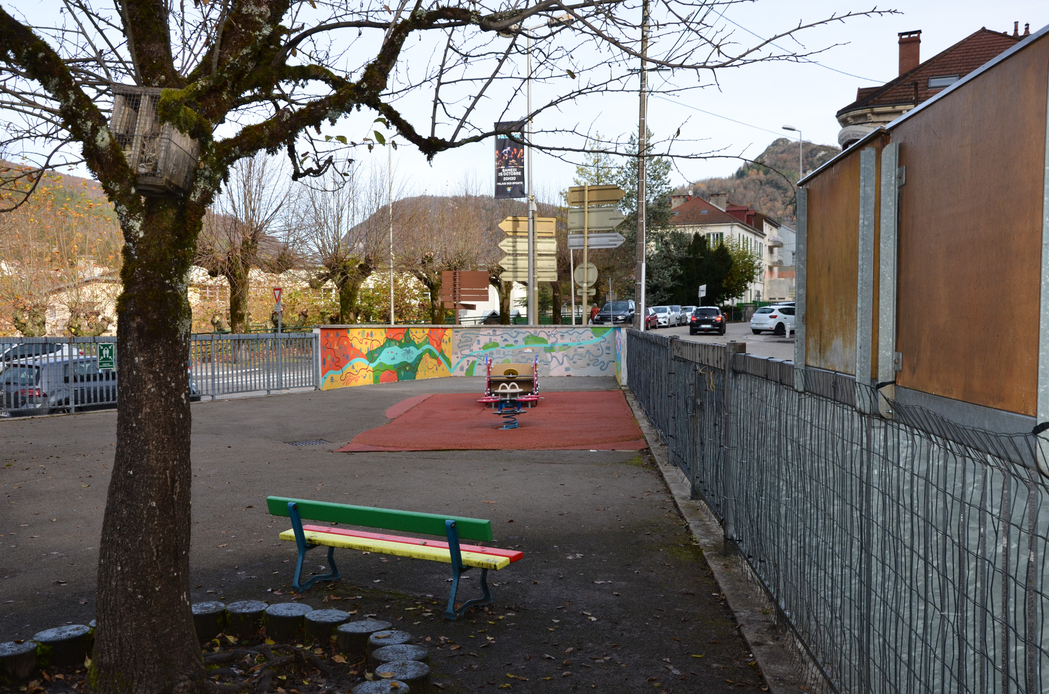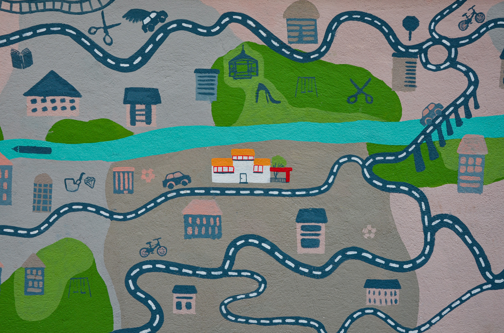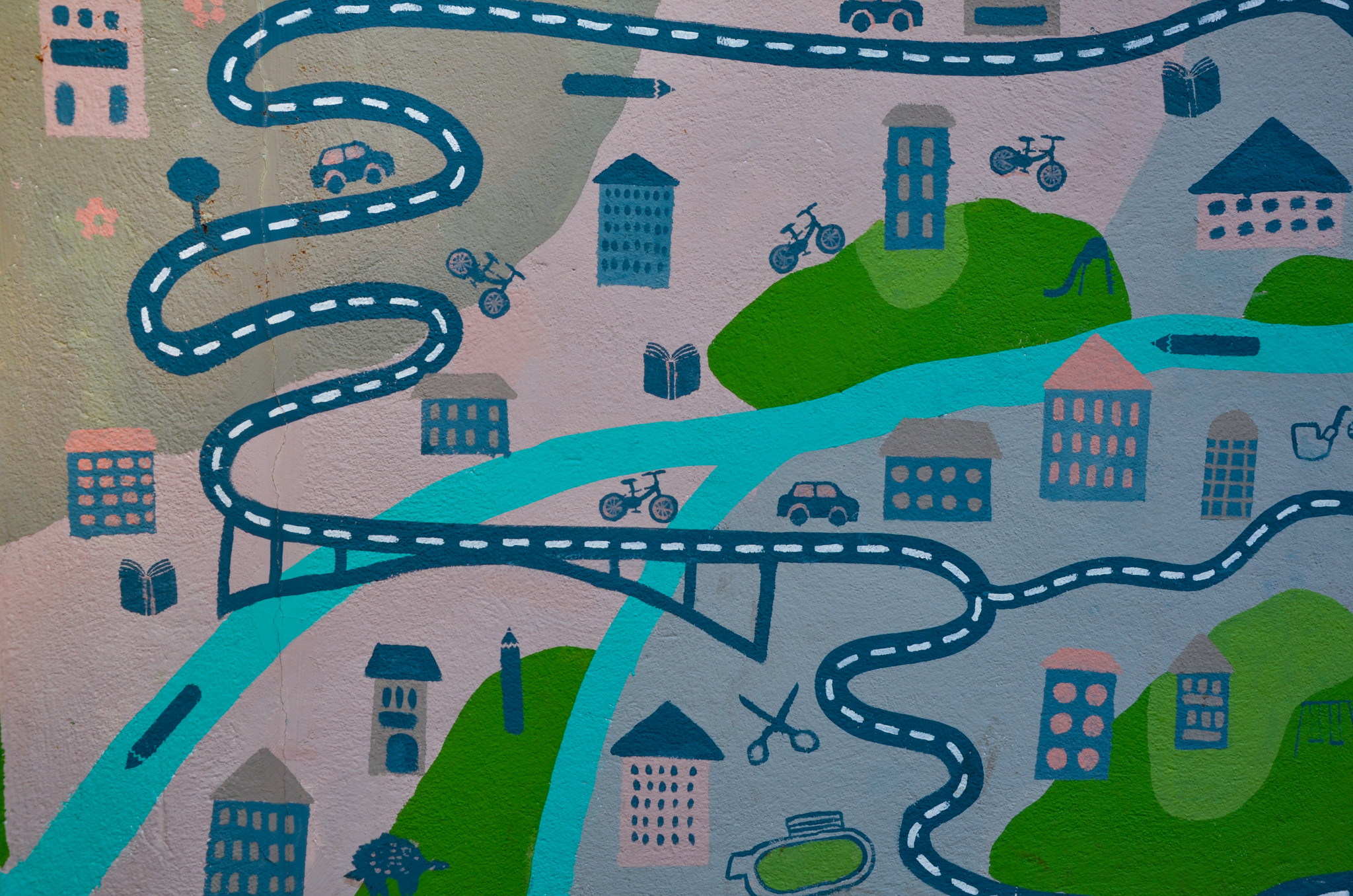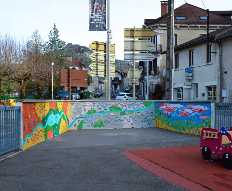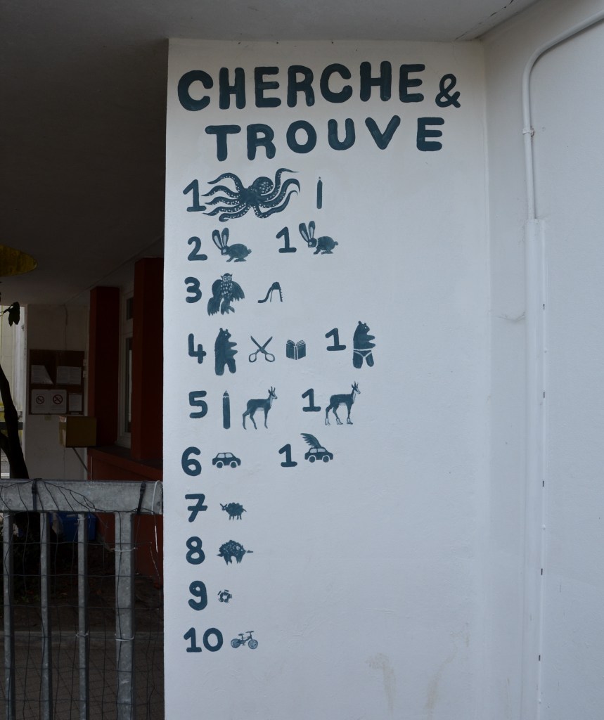 Conception et réalisation d’une fresque ludique sur trois murs de l’école maternelle avec divers jeux : labyrinthes, cherche et trouve, éléments à compter etc.