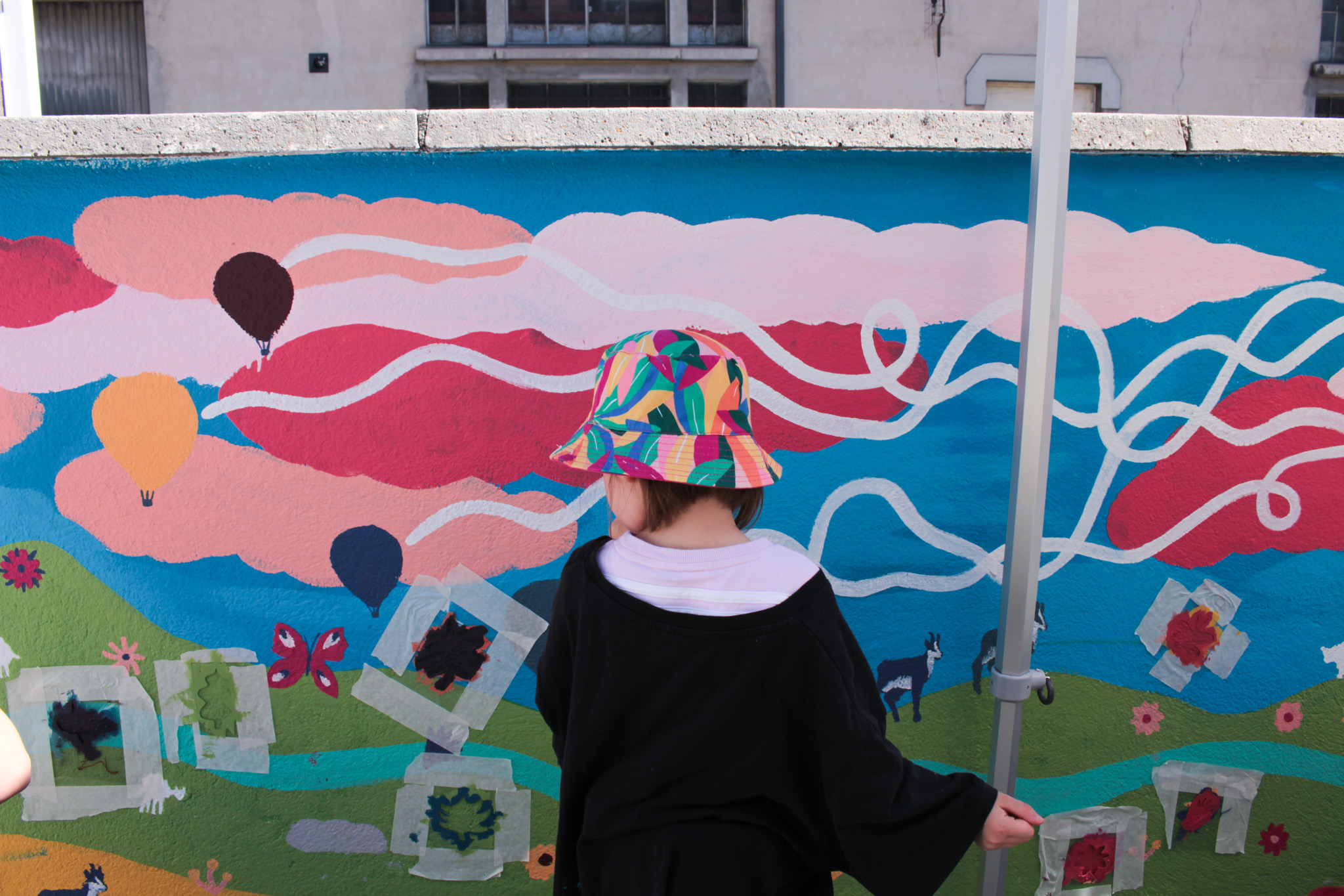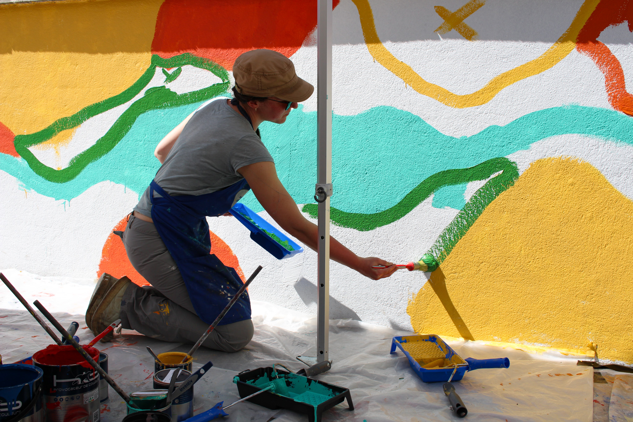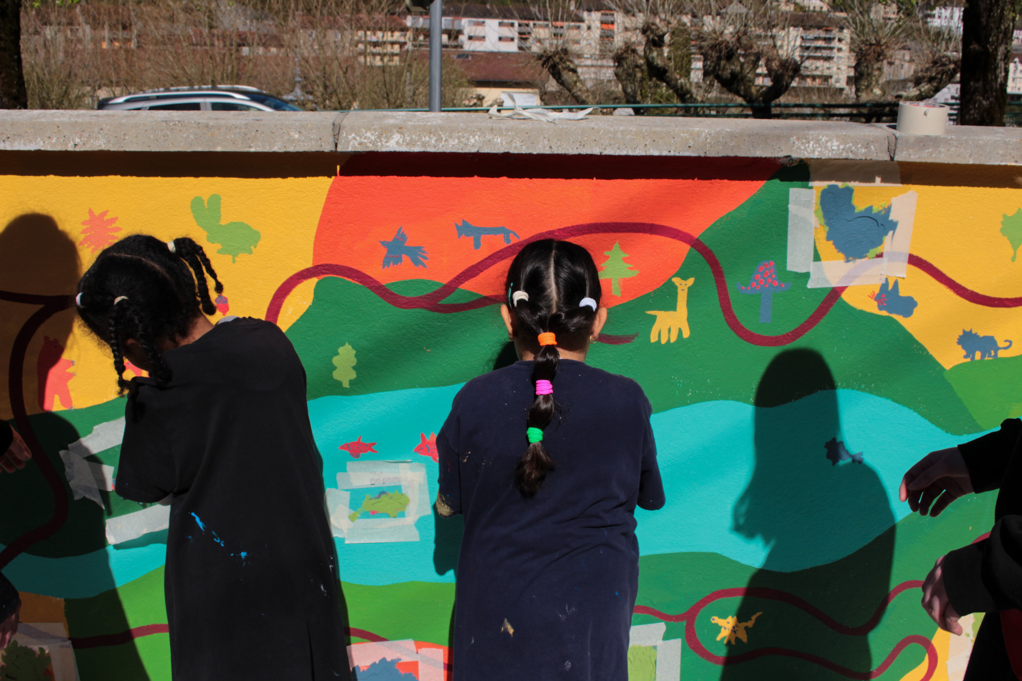 Peinture de la fresque sur une semaine avec des petits groupes d’élèves. Fond réalisé au rouleau + pochoirs de formes inspirés des dessins des enfants.