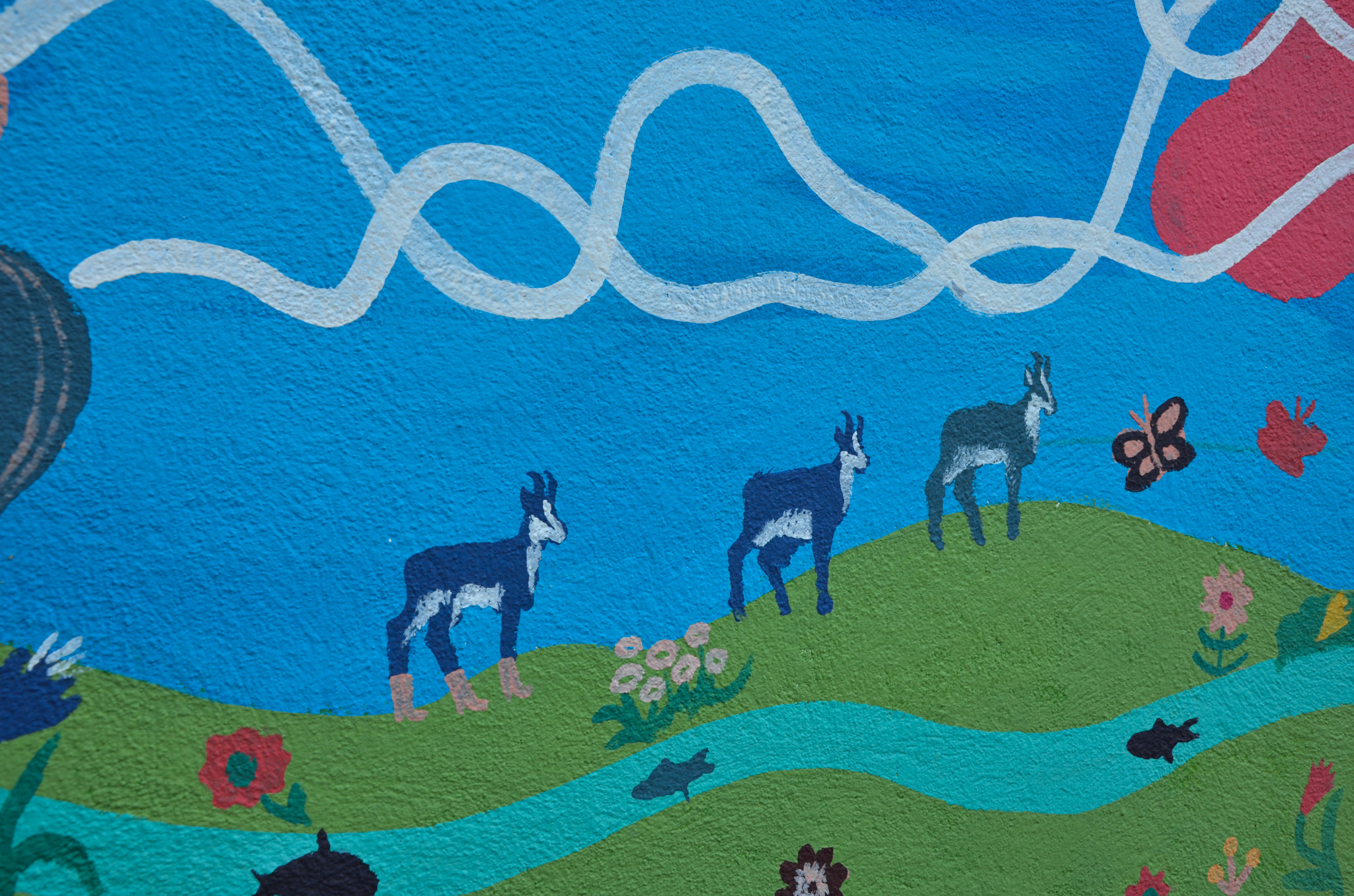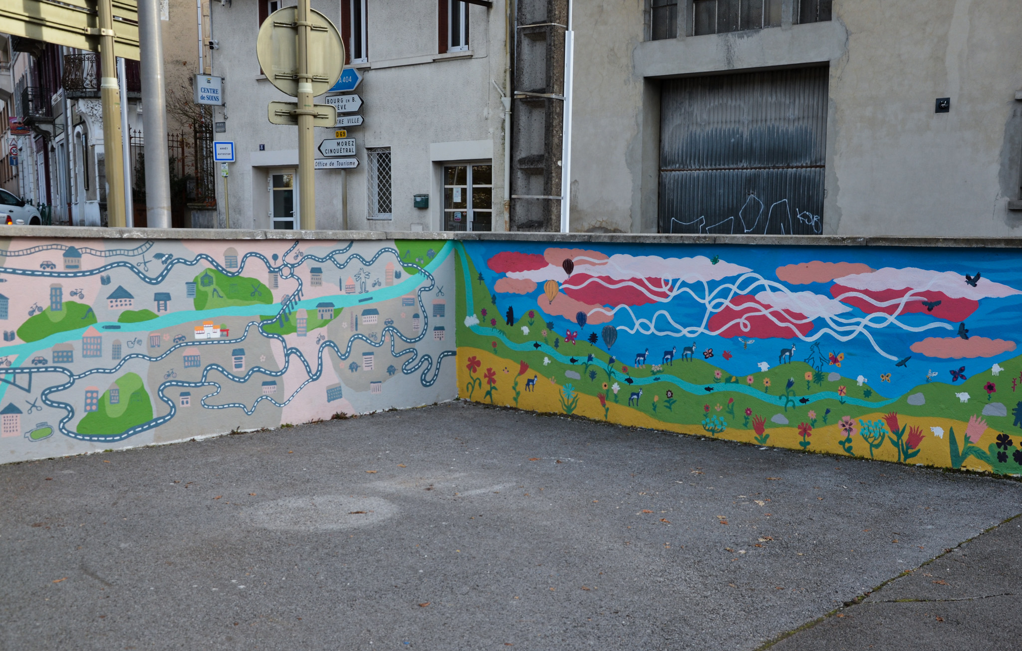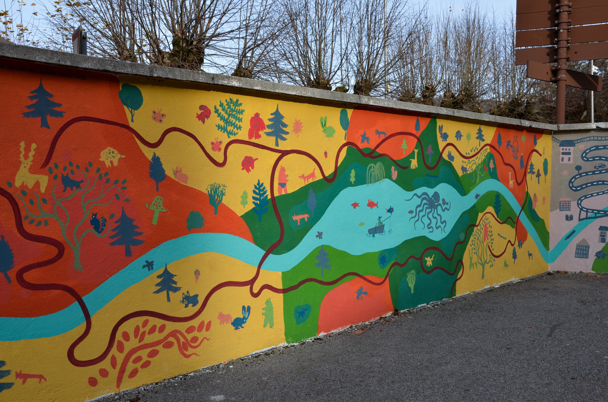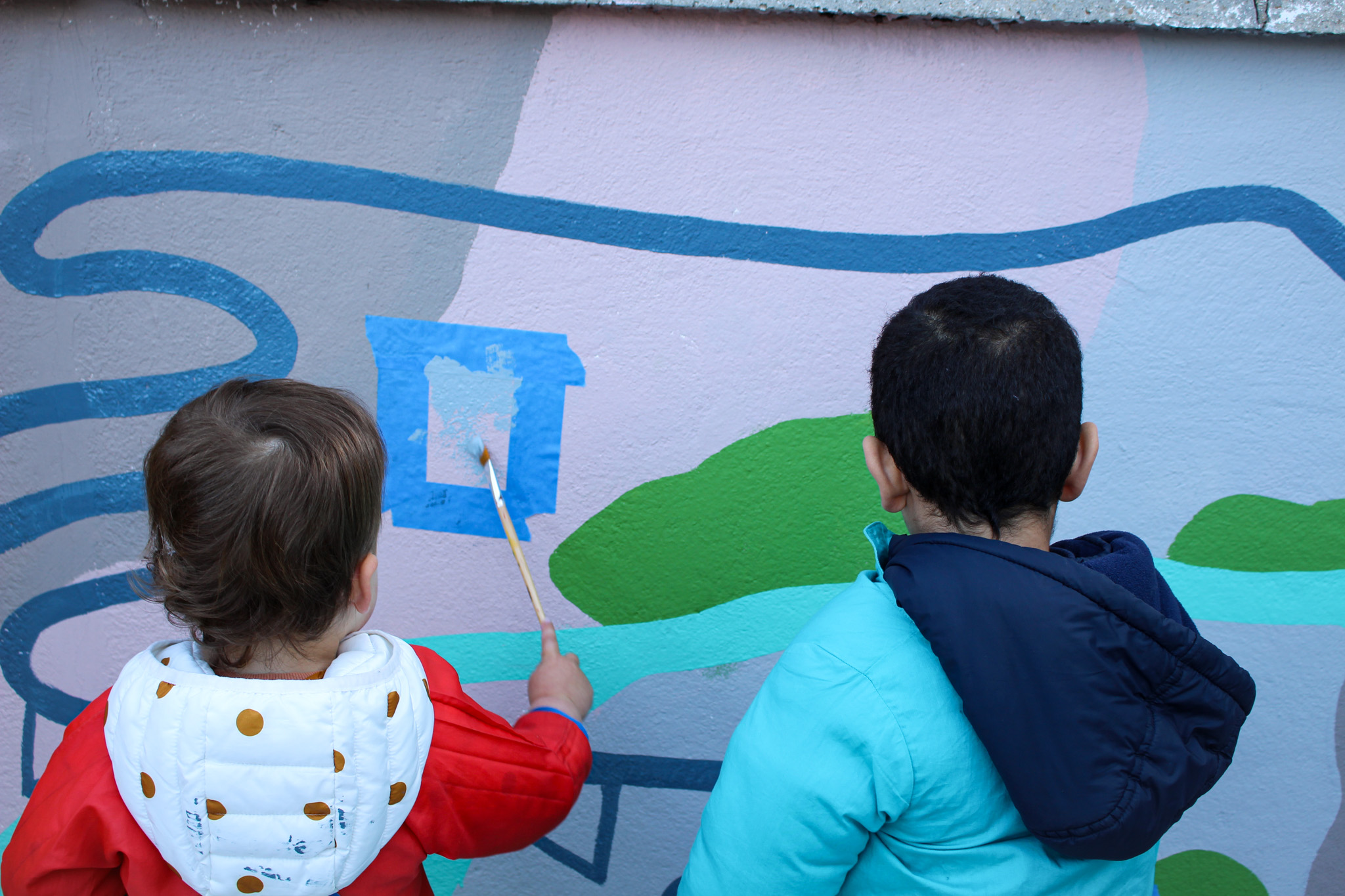 Peinture de la fresque sur une semaine avec des petits groupes d’élèves. Fond réalisé au rouleau + pochoirs de formes inspirés des dessins des enfants.