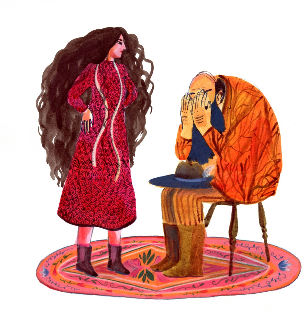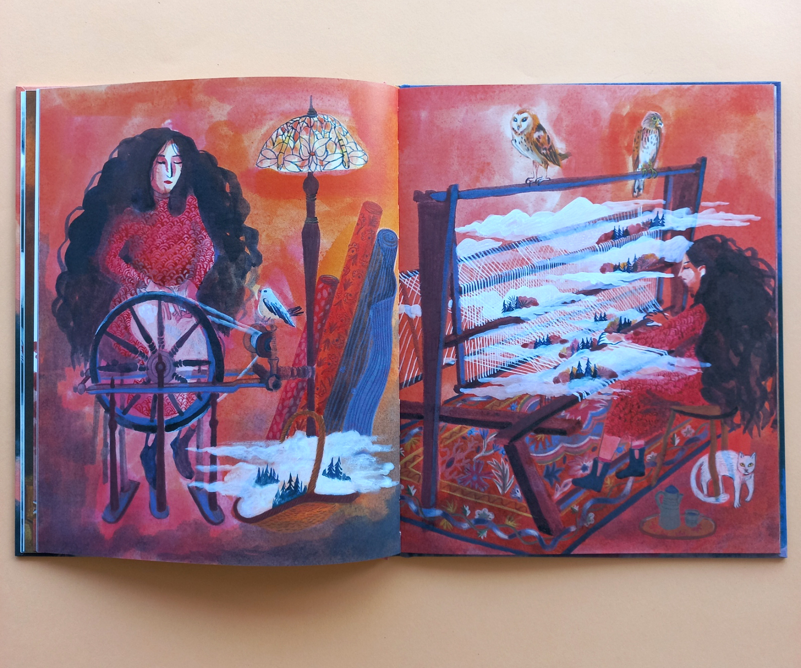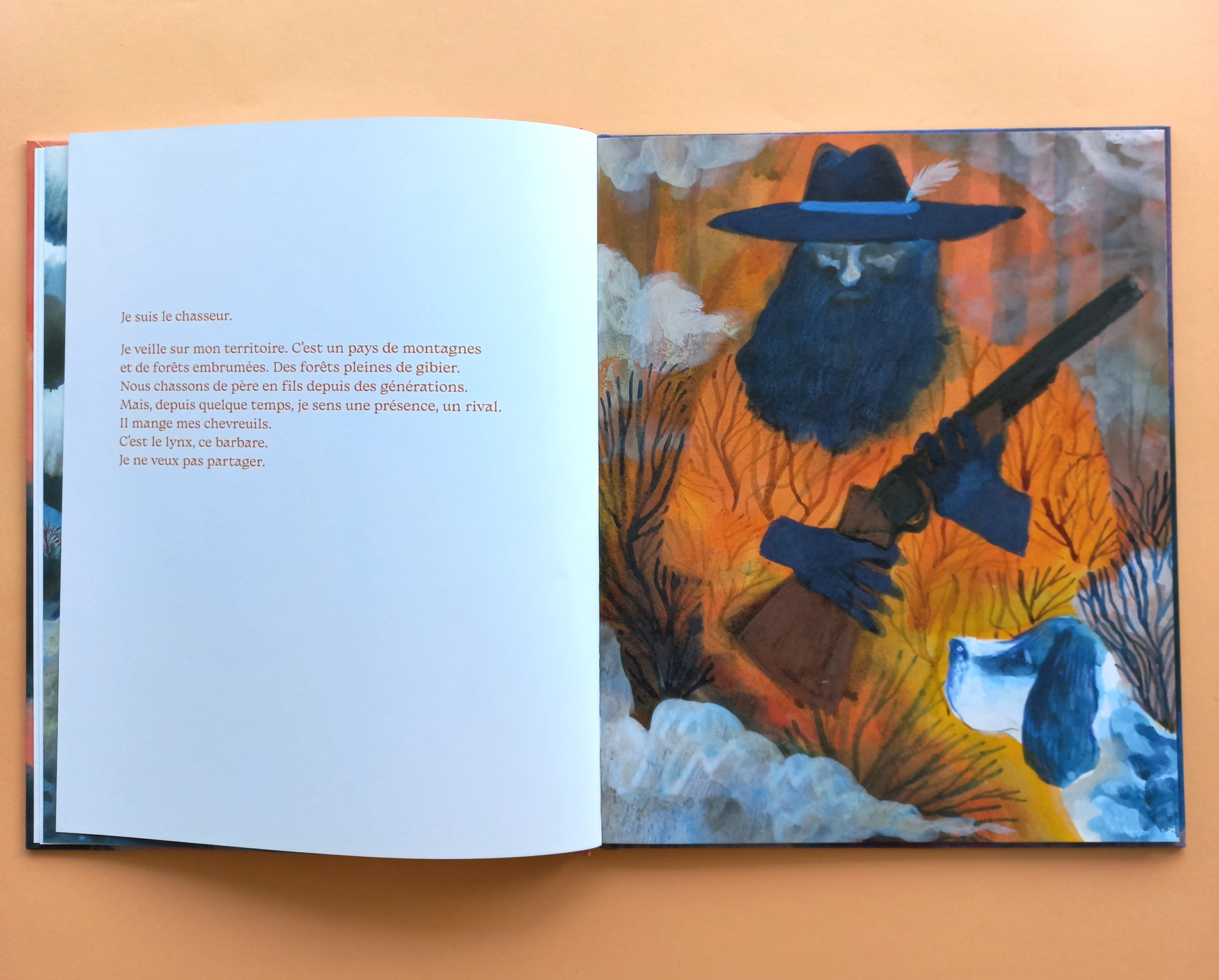 La couturière bâtira pour le lynx un manteau de paysage, qui le rendra invisible aux yeux du chasseur. Chasseur qui viendra pleurnicher, parce que les animaux le détestent et que le lynx reste introuvable, chez sa sœur… la couturière ! Et notre chasseur déprimé s’apaisera en tricotant et cousant.