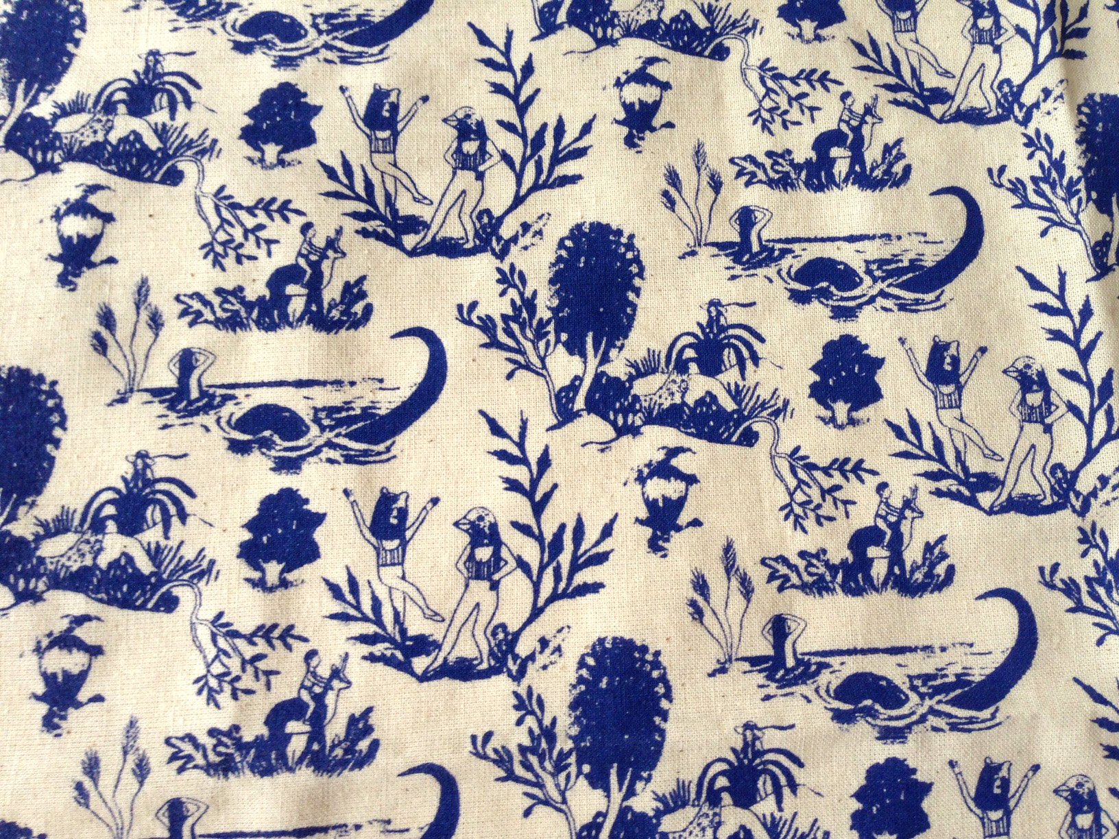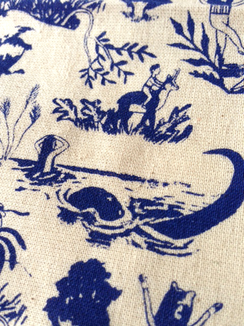 Motif textile inspiré par les anciennes toile de jouy et la légende de La Vouivre, imprimé en sérigraphie sur lin et toile de coton en collaboration avec la couturière Joanie Spaghettis.